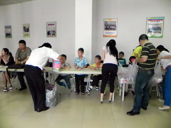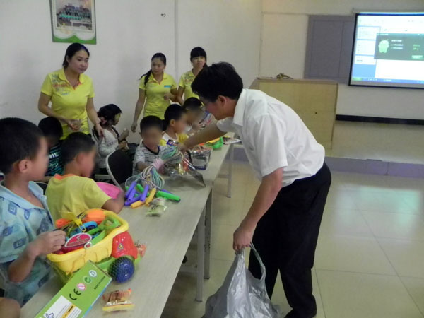 派发礼品啦,小朋友们开心得不得了,有玩具还有月饼,谢谢叔叔阿姨的爱心!