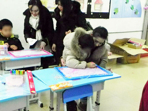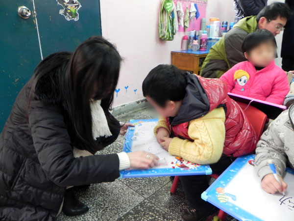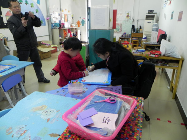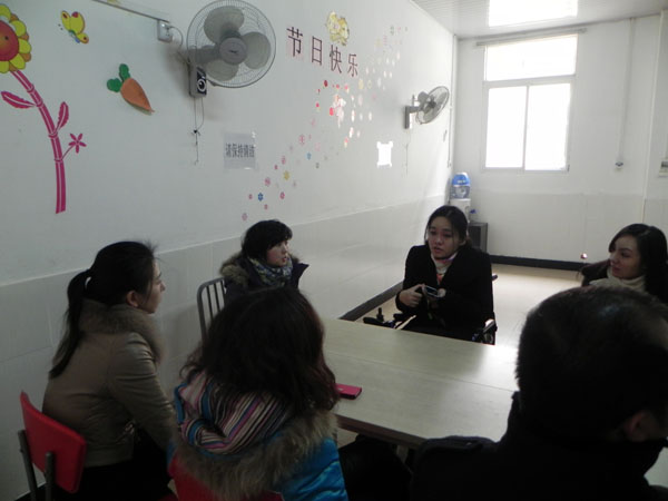 沈老师给爱心人士们介绍中心情况。