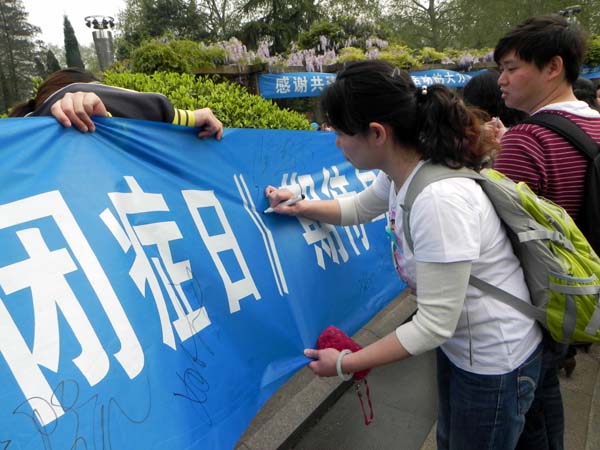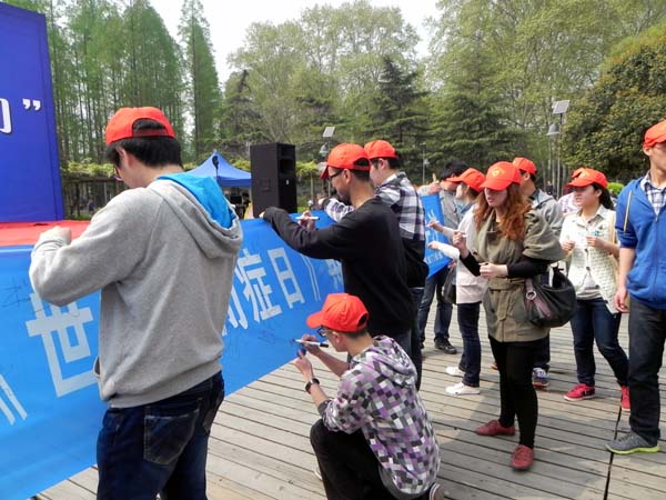共建单位成员和志愿者在“关注自闭症”横幅上签名。