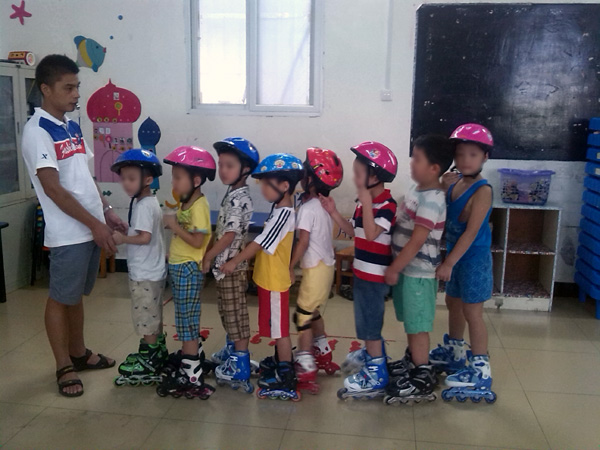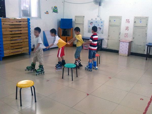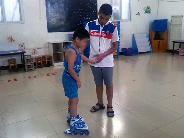学龄班开展特色运动课——滑旱冰。由于孤独症儿童大部分存在运动方面的问题,学龄班老师教孩子们用滑旱冰的方式锻炼平衡能力、运动能力,比普通运动更具趣味性。
