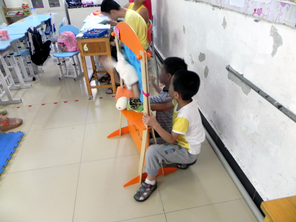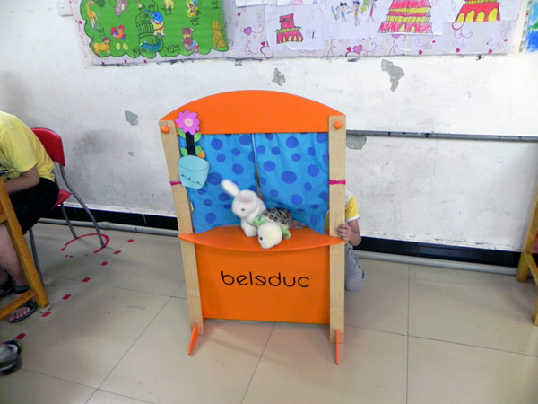 学龄班学生在老师的指导下排演木偶剧,对增强孩子们的互相协作能力很有帮助,提高他们的社会交往能力。