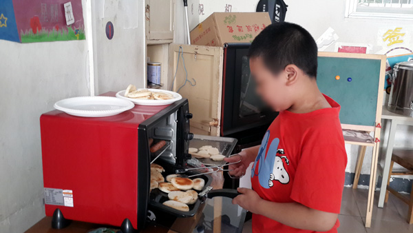 为了锻炼自闭症儿童的动手能力,学龄班组织学生在老师指导下用烤箱烤馍片,在保证安全的条件下,孩子做得相当不错。