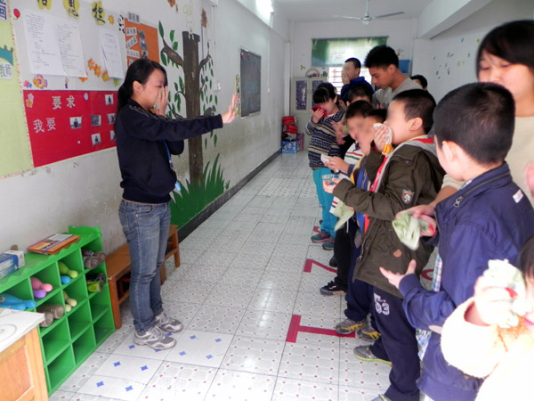 老师按照教官的要求教自闭症儿童用湿毛巾捂住口鼻。