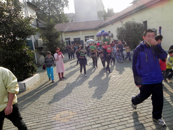 消防演习开始啦,大家赶紧按序跑出教室。
