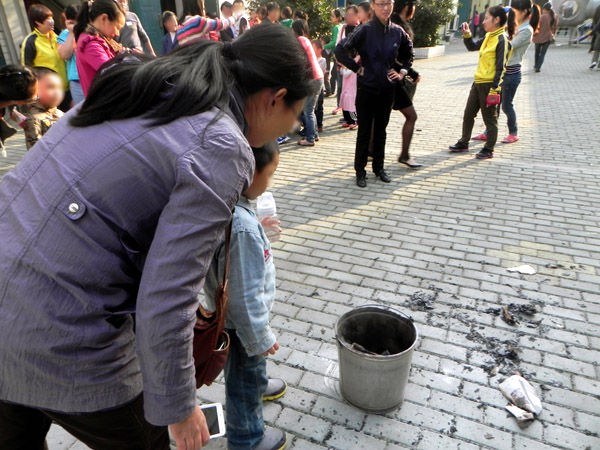 好奇的小朋友跑过来看桶里的燃烧物。