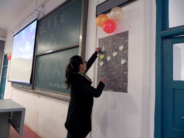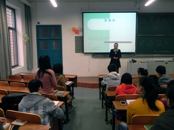 23日上午,中心刘老师受武汉大学志愿者协会邀请赴武大进行自闭症知识讲座。参加讲座的志愿者协会成员们听得很仔细,在提问环节与刘老师进行了气氛热烈的互动。最后,大家在爱心纸上写下帮助这群特殊孩子的心愿。