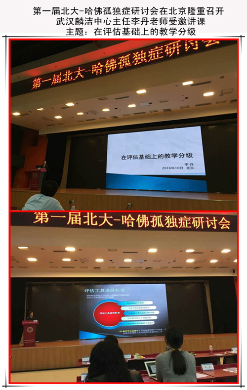 我中心主任李丹女士受邀参加在北京举办的第一届北大哈佛孤独症研讨会,在研讨会上李丹主任进行了讲话,主题:“在评估基础上的教学分级”重点说明要有效帮助ASD人士就必须先做好评估。在此基础上选择科学、有效、可操作性和适合ASD群体的评估工具至关重要。根据国外研究结果本次重点简要介绍了符合上述标准的在为数不多的四个评估工具中排在第一位的《语言行为里程碑评估及安置程序(VB-MAPP)》。在语言行为原理下,一个语言评估不仅要评估语言的形式和结构,更要注重语言的功能。另外,在VB-MAPP评估中还注重语言功能、基础学习能力和社会性游戏等技能的均衡性发展。与此同时不仅要评估语言功能的现有发展,还要评估妨碍孩子学习和社交的障碍,为孩子更好更快的发展扫清障碍指明了方向。并且对于每一个孩子的安置提供了科学的数据;为老师和家长提供了可参照和可操作的课程建议。作为专业人员的职责之一,就是在评估基础上为孩子找到一个最恰当的安置形式和最有效的教学方法和策略;最后,简略的介绍了在上述原则下武汉麟洁的教学分级模式。